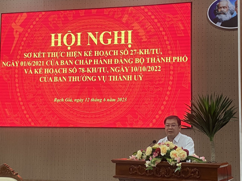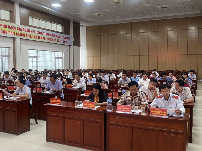 Chủ trì Hội nghị: (1) Đ/c Lê Thanh Việt, UV. BTV Tỉnh uỷ, Bí thư Thành uỷ; (2) Đ/c Nguyễn Văn Nhỏ, Phó Bí thư Thường trực Thành uỷ, Chủ tịch HĐND thành phố; (3) Đ/c Nguyễn Hoàn Xuân, Phó Bí thư Thành uỷ. Hội nghị đã phân tích, đánh giá nghiêm túc những kết quả đạt được củng như những hạn chế qua 02 năm thực hiện. Qua đó đề ra phương phướng, biện pháp thực hiện thời gian tới một cách sát thực, phù hợp,… tiến tới góp phần thực hiện thắng lợi Nghị quyết Đại hội lần thứ XII của Đảng bộ thành phố Rạch Giá.