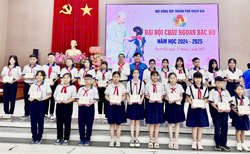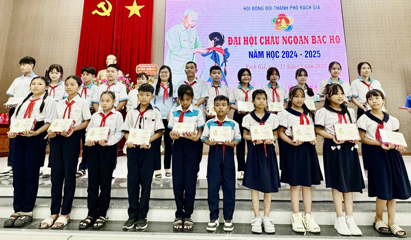 Ảnh: Đồng chí Dư Phạm Hữu Khuyến, Phó Bí thư Tỉnh đoàn - Chủ tịch Hội đồng đội tỉnh Kiên Giang (thứ 7 từ phải qua) và đồng chí Nguyễn Văn Nhỏ, Phó Bí thư thường trực Thành ủy - Chủ tịch Hội đồng nhân dân thành phố (thứ 8 từ phải qua) tặng quà và trao giấy chứng nhận cho các em học sinh Đạt danh hiệu Cháu ngoan Bác Hồ cấp thành phố, năm học 2024 - 2025.
