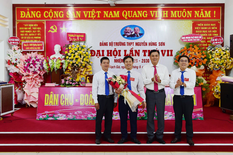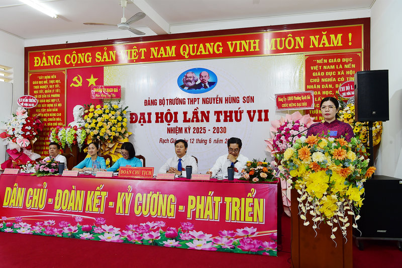Ảnh: Đồng chí Nguyễn Thị Hoàn Xuân, Phó Bí thư Thành ủy Rạch Giá – Tổ trưởng Tổ Chỉ đạo đại hội các chi, đảng bộ cơ sở nhiệm kỳ 2025-2030 (thứ bảy trái qua) trao tặng hoa chúc mừng Ban Chấp hành Đảng bộ Trường Trung học phổ thông Nguyễn Hùng Sơn lần thứ VII, nhiệm kỳ 2025-2030