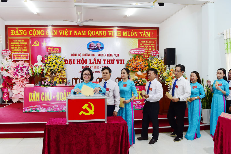 Ảnh: Đồng chí Nguyễn Thị Mai, Bí Thư Đảng bộ Trường Trung học phổ thông Nguyễn Hùng Sơn và các thành viên Đoàn Chủ tịch bỏ phiếu bầu Ban Chấp hành Đảng bộ Trường Trung học phổ thông Nguyễn Hùng Sơn lần thứ VII, nhiệm kỳ 2025-2030