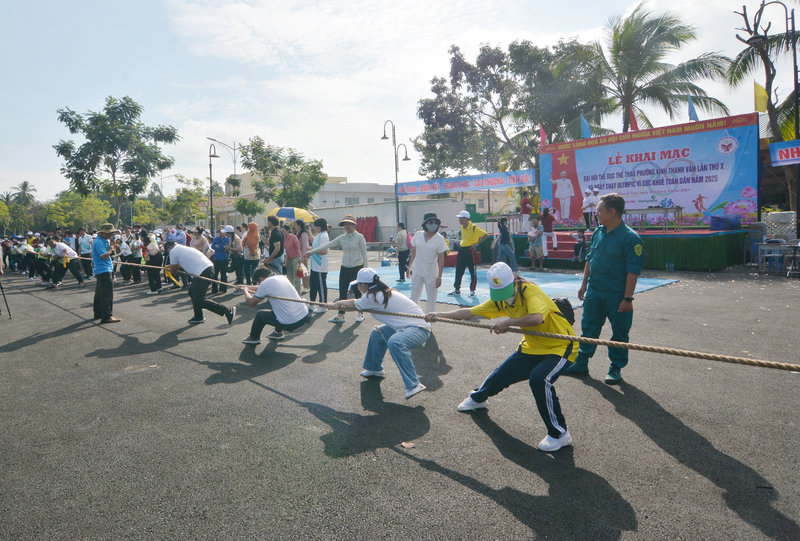 Ảnh: Bộ môn kéo co được thi đấu ngay sau khai mạc đại hội trong tổng số 7 bộ môn thi đấu gồm: Điền kinh, Đẩy gậy, Kéo co, Cờ tướng, Bóng đá, Cầu lông và Bơi lội.