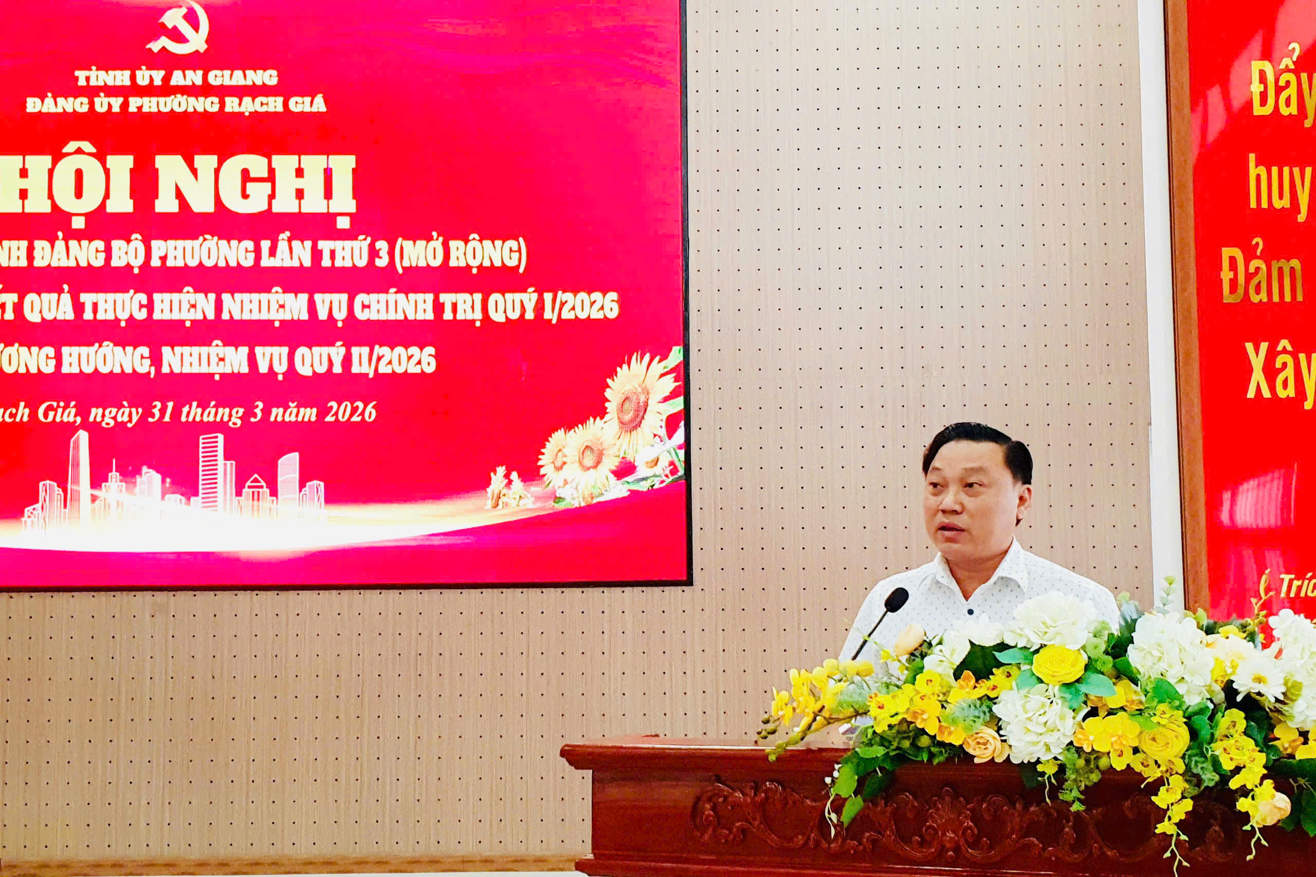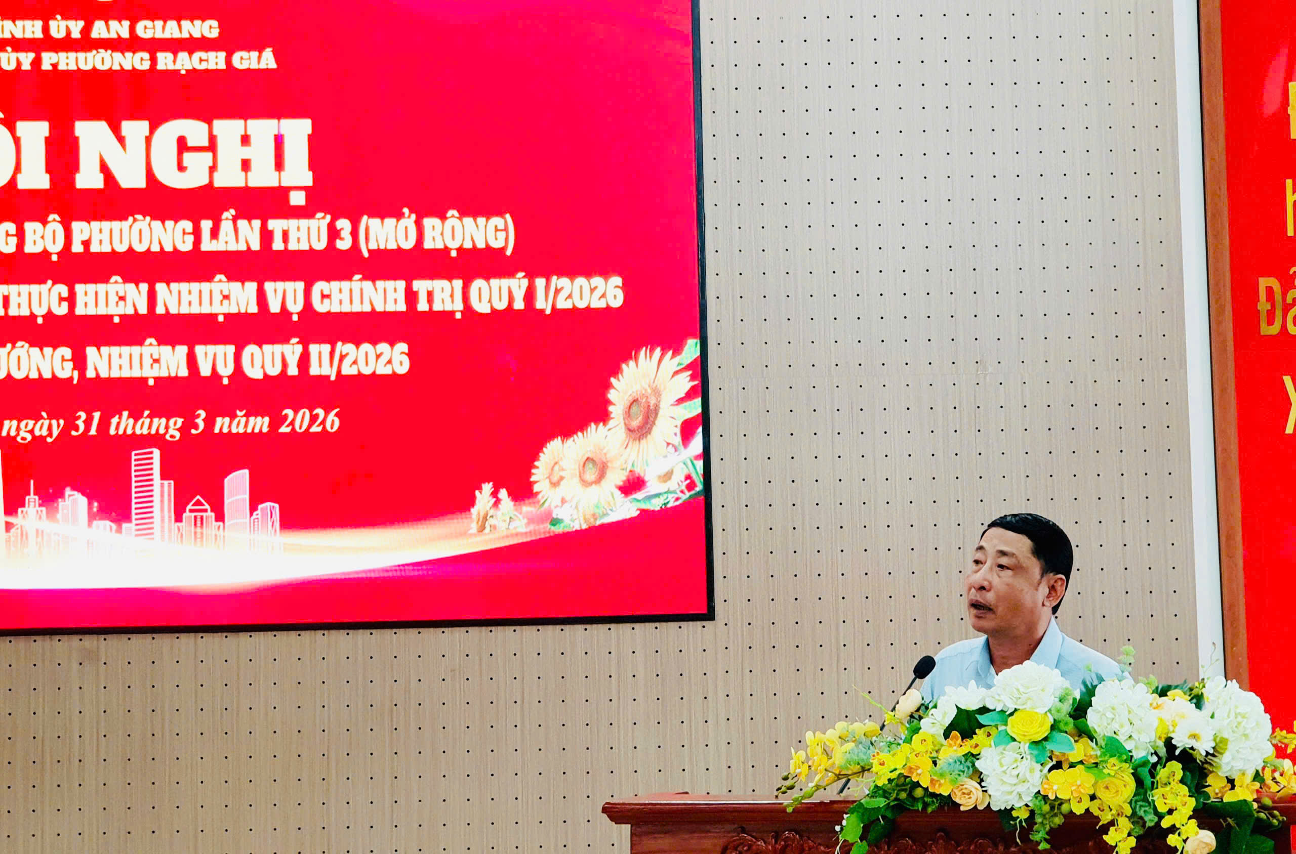 Ngày 31/3, Đảng ủy phường Rạch Giá đã tổ chức Hội nghị Ban Chấp hành Đảng bộ lần thứ 3 (mở rộng) nhằm đánh giá kết quả công tác quý I và triển khai phương hướng nhiệm vụ quý II năm 2026. Đồng chí Mai Hoàng Khởi - Ủy viên Ban Thường vụ Tỉnh ủy, Bí thư Đảng ủy phường chủ trì hội nghị.
