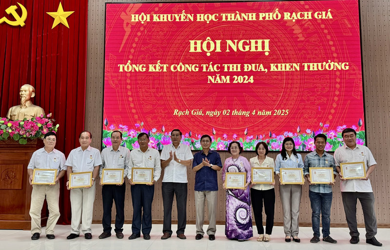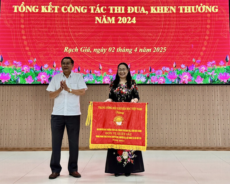 Ảnh: Đồng chí Nguyễn Văn Nhỏ, Phó Bí thư thường trực Thành ủy - Chủ tịch Hội đồng nhân dân thành phố (bên trái) trao cờ thi đua xuất sắc trong phong trào thi đua khuyến học, khuyến tài, xây dựng xã hội học tập năm 2024 của Trung ương Hội Khuyến học Việt Nam cho tập thể Hội Khuyến học phường Vĩnh Lạc, thành phố Rạch Giá.