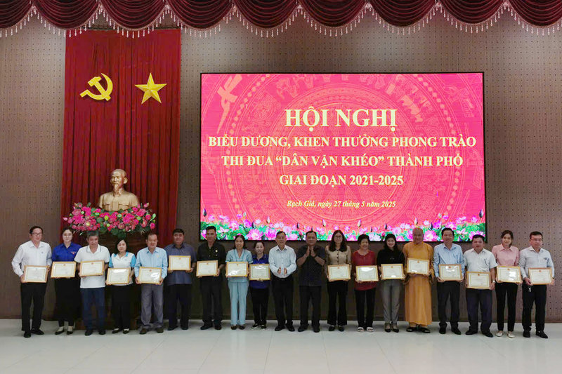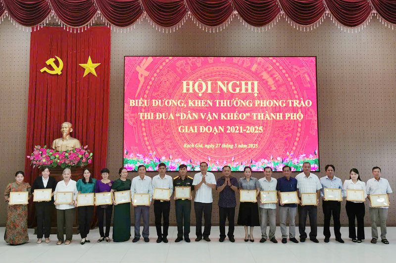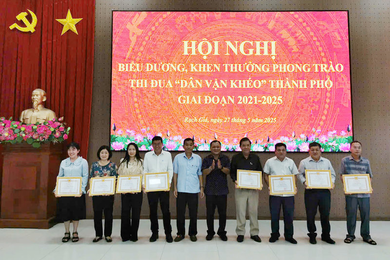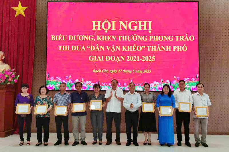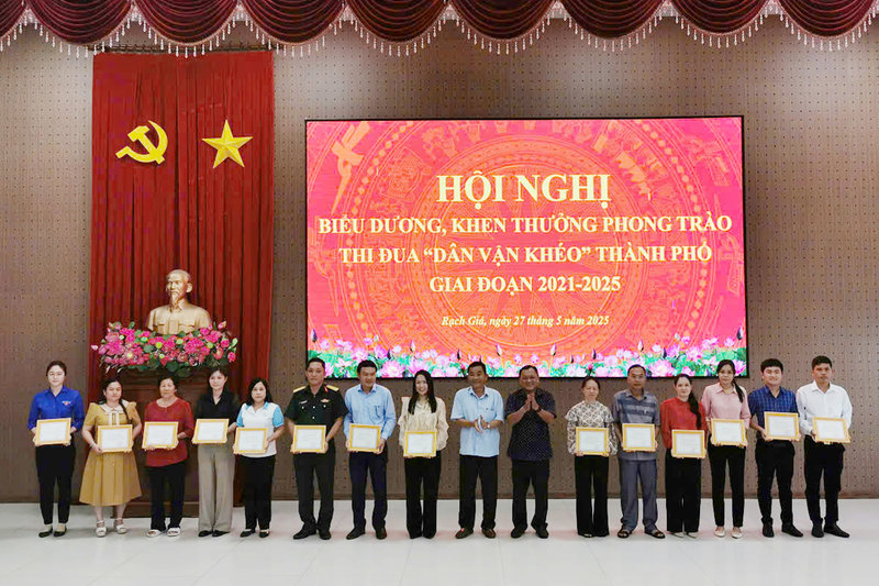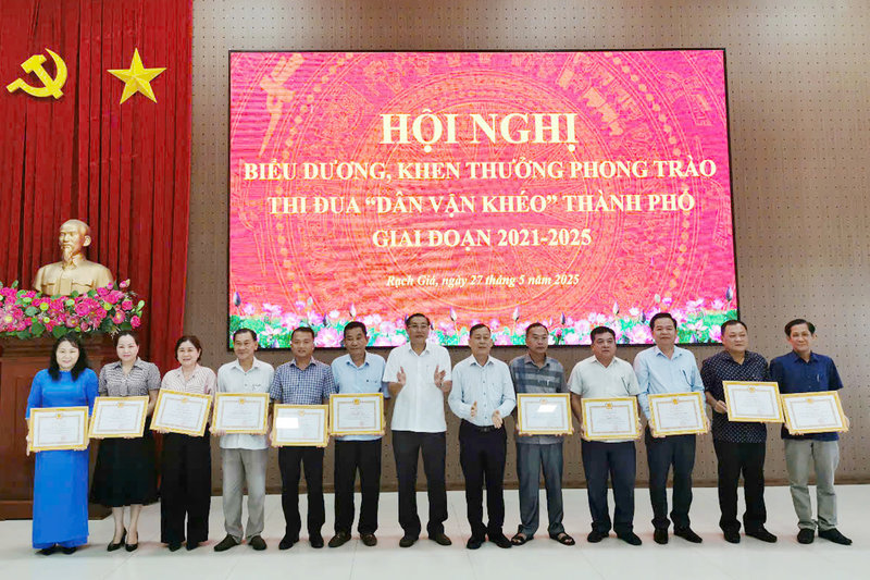 Ảnh: Ban Chấp hành Đảng bộ thành phố đã đã trao tặng giấy khen cho các tập thể và cá nhân đạt thành tích xuất sắc trong lãnh đạo, chỉ đạo, thực hiện phong trào thi đua “Dân vận khéo” thành phố Rạch Giá, giai đoạn 2021-2025. Ủy ban nhân dân thành phố trao tặng giấy khen cho các tập thể và cá nhân đạt thành tích tốt trong phong trào thi đua “Dân vận khéo” thành phố Rạch Giá, giai đoạn 2021-2025./.