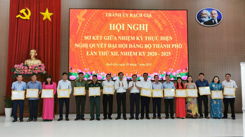 Tại hội nghị, Đồng chí Đỗ Thanh Bình - Ủy viên Ban Chấp hành Trung ương Đảng, Bí thư Tỉnh ủy, Trưởng đoàn Đại biểu Quốc hội Khóa XV đơn vị tỉnh Kiên Giang và đồng chí Lê Thanh Việt - Ủy viên Ban Thường vụ Tỉnh ủy, Bí thư Thành ủy Rạch Giá đã trao tặng giấy khen của Ban Chấp hành Đảng bộ thành phố Rạch Giá cho 15 tập thể chi bộ, đảng bộ ban, ngành, đoàn thể và phường đạt thành tích thực hiện tốt Nghị quyết Đại hội Đảng bộ thành phố Rạch Giá lần thứ XII, nhiệm kỳ 2020-2025./.