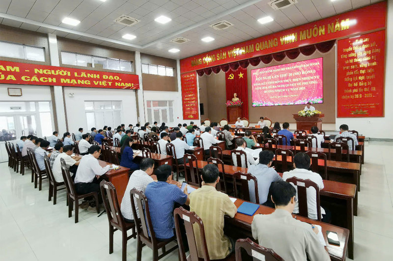 Ảnh: Toàn cảnh Hội nghị lần thứ hai mươi Ban Chấp hành Đảng bộ thành phố khóa XII, nhiệm kỳ 2020-2025 mở rộng tại Hội trường Thành ủy Rạch Giá