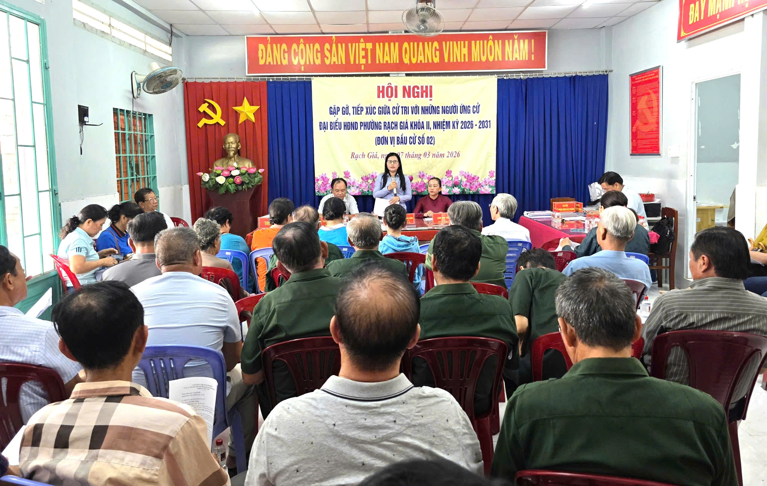 Chiều ngày 07/3/2026, tại trụ sở khu phố Nguyễn Bỉnh Khiêm, Ban Thường trực Ủy ban MTTQ Việt Nam phường Rạch Giá phối hợp với UBND phường tổ chức Hội nghị gặp gỡ, tiếp xúc giữa cử tri với những người ứng cử đại biểu Hội đồng nhân dân phường Rạch Giá khóa II, đơn vị bầu cử số 02, thực hiện quyền vận động bầu cử.