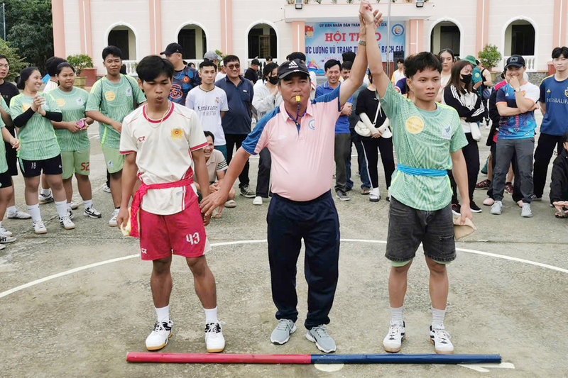 Ảnh: Trọng tài công bố vận động viên thắng cuộc bộ môn đẩy gậy ở lượt thi đấu loại trực tiếp