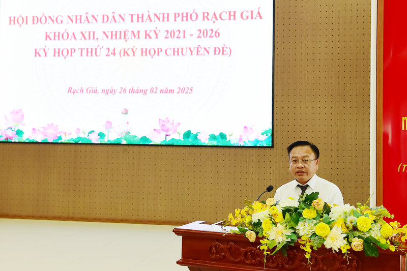 Ảnh: Đồng chí Bùi Phước Châu, Phó Bí thư Thành ủy, Chủ tịch Ủy ban nhân dân thành phố Rạch Giá khóa XII, nhiệm kỳ 2021-2026 phát biểu nêu quyết tâm hoàn thành tốt nhiệm vụ vừa được đại biểu tín nhiệm bầu giữ chức Chủ tịch Ủy ban nhân dân thành phố