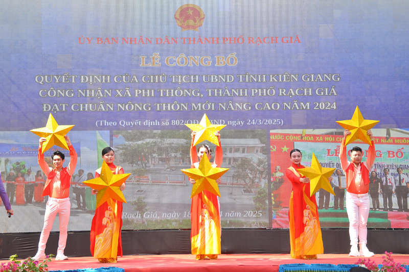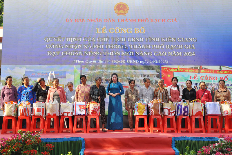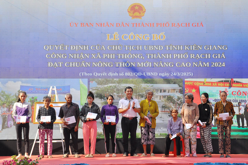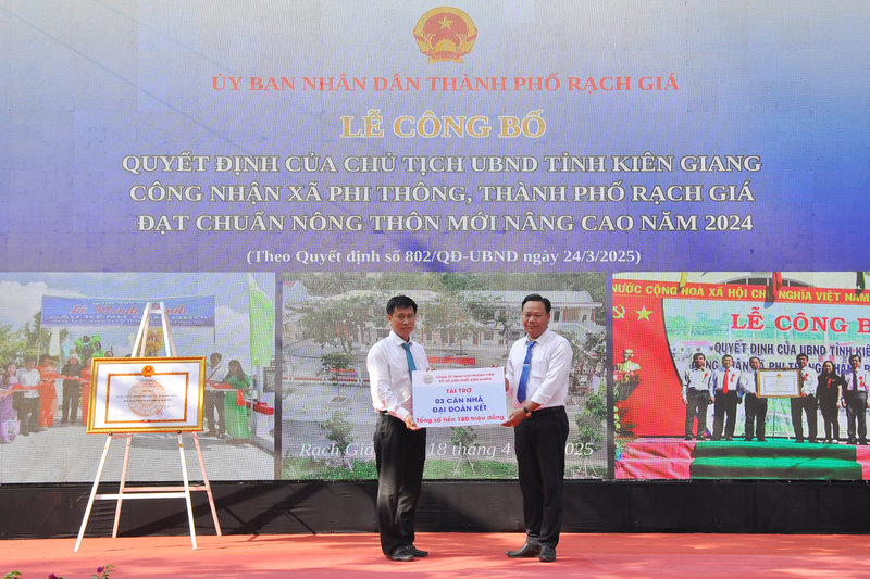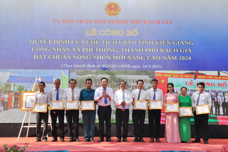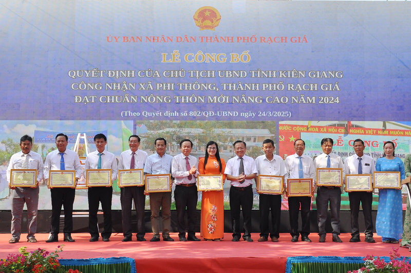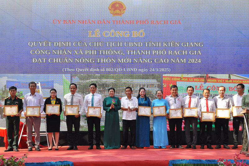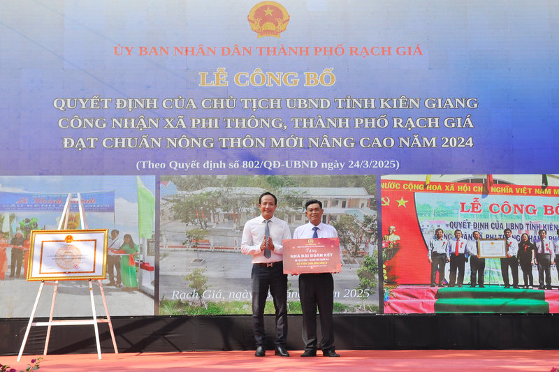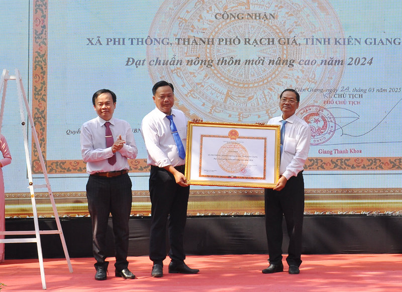 Ảnh: Ông Ngô Phương Vũ, Phó Chủ tịch Ủy ban Mặt trận Tổ quốc tỉnh – Thành viên Ban Chỉ đạo các Chương trình mục tiêu quốc gia tỉnh Kiên Giang (bên trái) đã trao bằng của Chủ tịch Ủy ban nhân dân tỉnh Kiên Giang công nhận xã Phi Thông đạt chuẩn Nông thôn mới nâng cao năm 2024