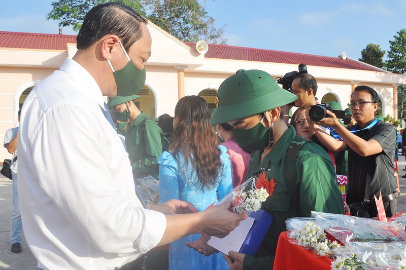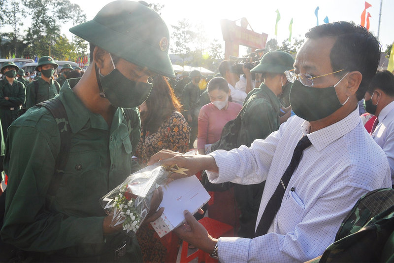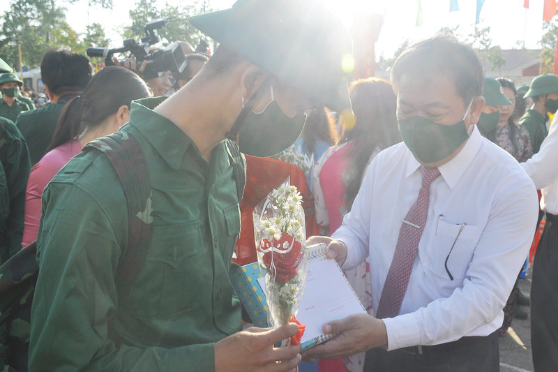 Đồng chí Lâm Minh Thành – Phó Bí thư Tỉnh ủy, Chủ tịch Ủy ban nhân dân, Chủ tịch Hội đồng Nghĩa vụ quân sự tỉnh Kiên Giang đến dự, trao tặng hoa và quà chúc mừng tân binh thành phố Rạch Giá.