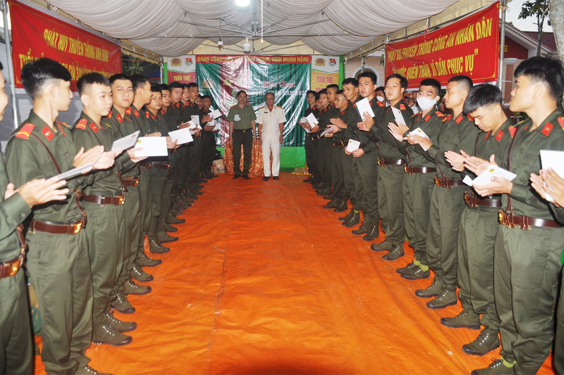 Ngay từ sáng sớm, các tân binh đã trang phục chỉnh tề, đeo khẩu trang, hàng ngũ chỉnh tề theo từng đơn vị nhận quân.