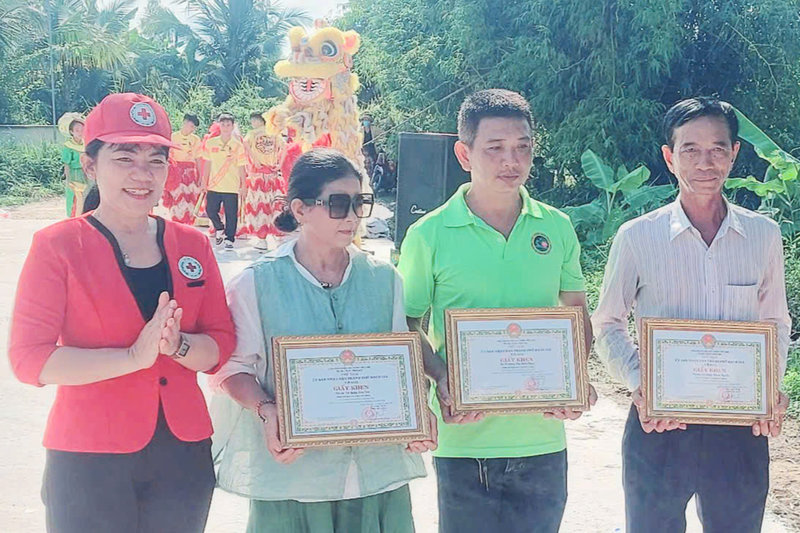 Ảnh: Đồng chí Nguyễn Thị Thảo, Phó chủ tịch Hội chữ thập đỏ thành phố Rạch Giá trao tặng giấy khen của Ủy ban nhân dân thành phố cho tập thể, cá nhân thực hiện tốt công tác an sinh xã hội trên địa bàn xã Phi Thông.