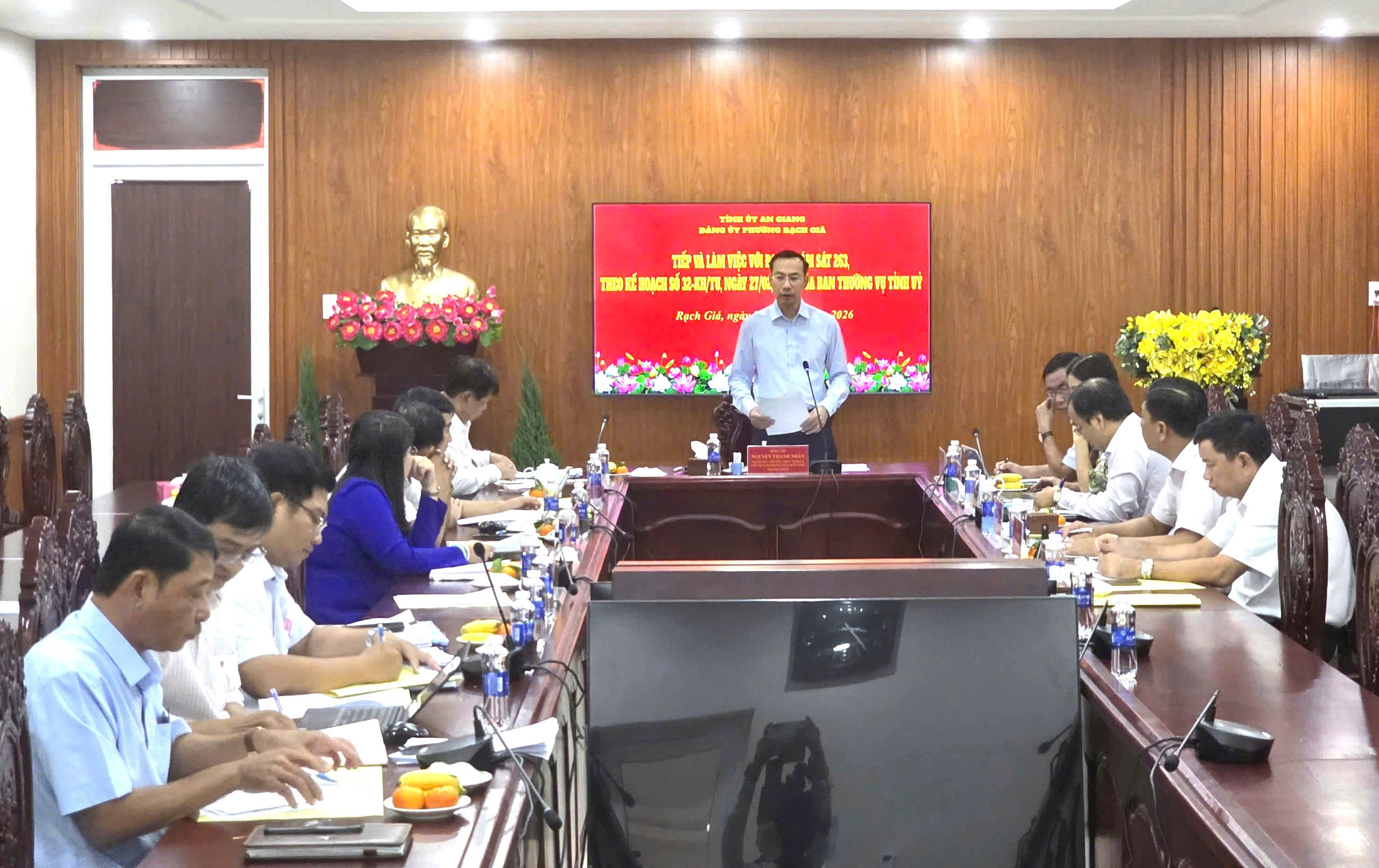 Sáng ngày 25/3/2026, Đoàn Giám sát số 263 của Ban Thường vụ Tỉnh ủy An Giang do Phó Bí thư Thường trực Tỉnh ủy, Chủ tịch HĐND tỉnh Nguyễn Thanh Nhàn làm trưởng đoàn đã có buổi làm việc với Ban Thường vụ Đảng ủy phường Rạch Giá. Nội dung làm việc tập trung vào công tác lãnh đạo, chỉ đạo nghiên cứu, học tập, quán triệt và triển khai thực hiện Nghị quyết Đại hội đại biểu toàn quốc lần thứ XIV của Đảng cùng các chương trình hành động thực hiện Nghị quyết Đại hội Đảng bộ tỉnh lần thứ I, nhiệm kỳ 2025 - 2030. Tiếp và làm việc với đoàn có Ủy viên Ban Thường vụ Tỉnh ủy, Bí thư Đảng ủy phường Rạch Giá Mai Hoàng Khởi cùng các đồng chí trong ban Thường vụ Đảng ủy phường và một số ngành có liên quan.