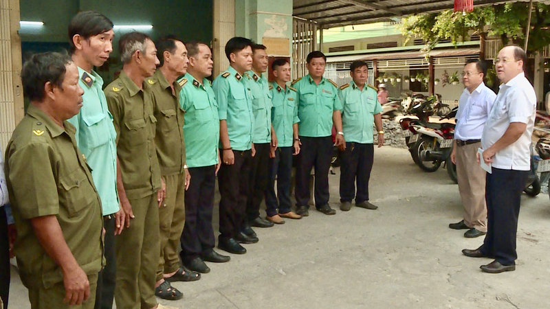 Ảnh: Đồng chí Nguyễn Thanh Phong, Ủy viên Ban Thường vụ Tỉnh ủy - Phó Chủ tịch Ủy ban nhân dân tỉnh (thứ nhất bên phải) và đồng chí Bùi Phước Châu, Phó Bí thư Thành ủy - Chủ tịch Ủy ban nhân dân thành phố Rạch Giá (thứ hai bên phải) thăm hỏi lực lượng trật tự đô thị phường Vĩnh Quang.