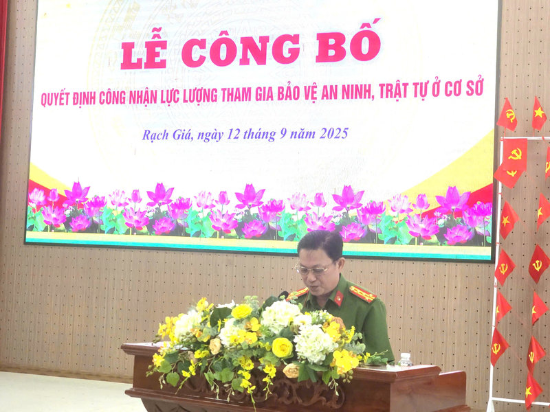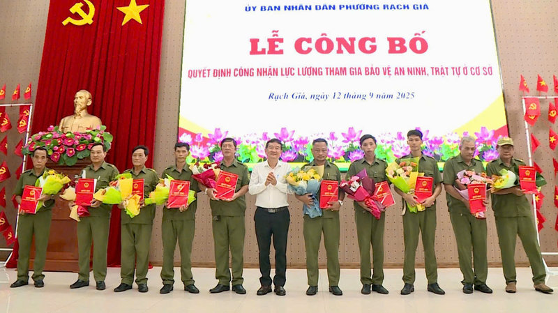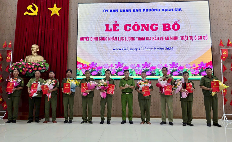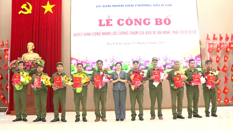 Sáng ngày 12/9/2025, tại Hội trường Đảng ủy phường Rạch Giá, UBND phường đã tổ chức Lễ công bố Quyết định công nhận lực lượng tham gia bảo vệ an ninh, trật tự ở cơ sở. Tham dự buổi lễ có Đại tá Diệp Văn Thế - Phó Giám đốc Công an tỉnh An Giang; Đ/c Nguyễn Thị Hoàn Xuân - Phó Bí thư Thường trực Đảng ủy, Chủ tịch HĐND phường; Đ/c Bùi Trung Thực - Phó Bí thư Đảng ủy, Chủ tịch UBND phường Rạch Giá và Đ/c Phạm Thị Bích Quyên – Ủy viên Ban Thường vụ Đảng ủy, Phó Chủ tịch HĐND phường.