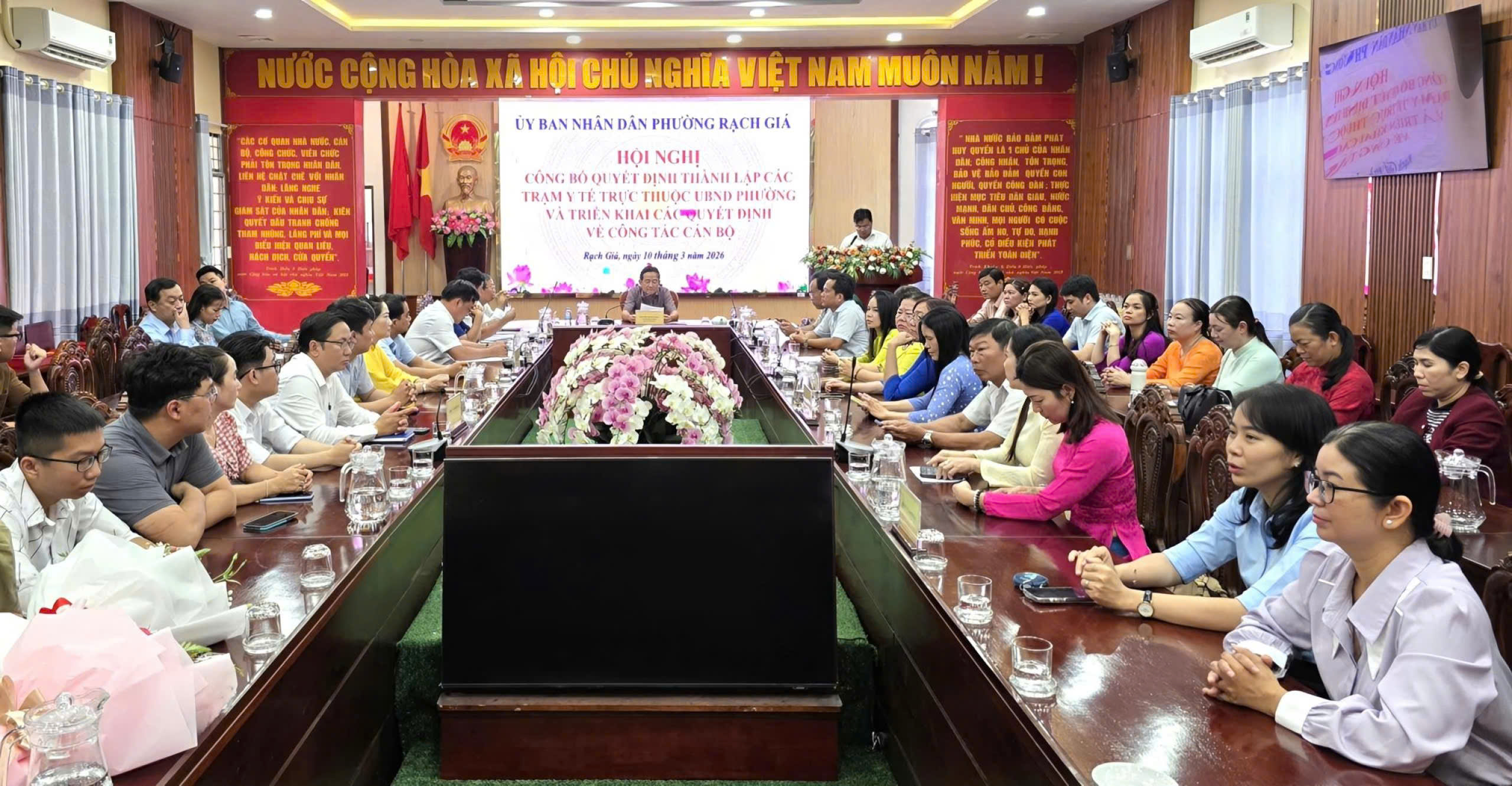 Ngày 10/3/2026, UBND phường Rạch Giá tổ chức hội nghị công bố Quyết định thành lập các Trạm Y tế trực thuộc và triển khai công tác cán bộ. Đây là bước đi cụ thể nhằm thực hiện chủ trương kiện toàn bộ máy tổ chức, nâng cao năng lực y tế cơ sở và đáp ứng kịp thời nhu cầu chăm sóc sức khỏe cộng đồng tại địa bàn dân cư.