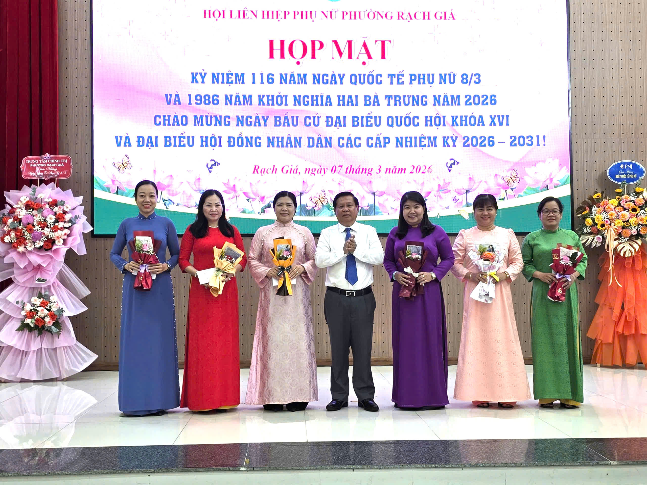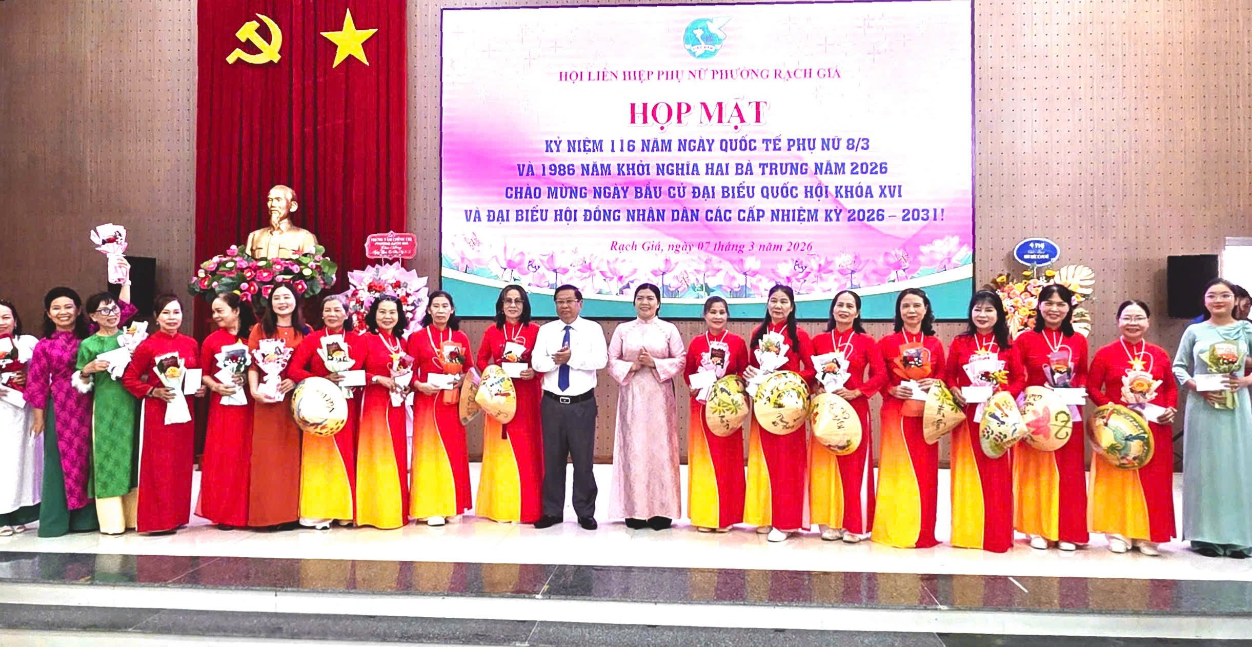 Ngày 07/3/2026, Hội Liên hiệp Phụ nữ phường Rạch Giá tổ chức họp mặt kỷ niệm 116 năm Ngày Quốc tế Phụ nữ (8/3/1910 – 8/3/2026) và 1986 năm Khởi nghĩa Hai Bà Trưng. Buổi họp mặt diễn ra trong không khí trang trọng, ấm áp, thu hút đông đảo cán bộ, hội viên phụ nữ trên địa bàn tham dự.