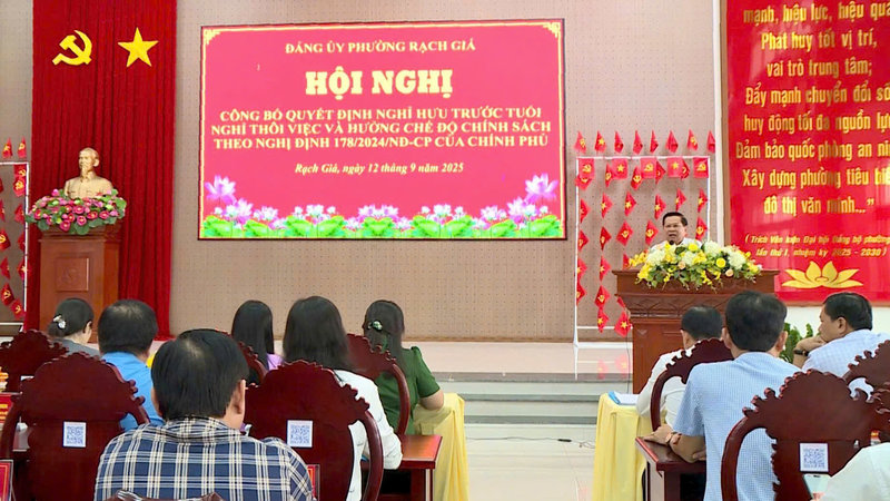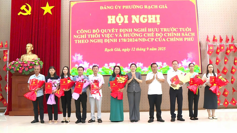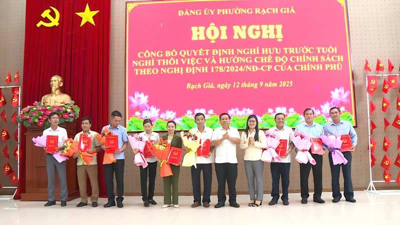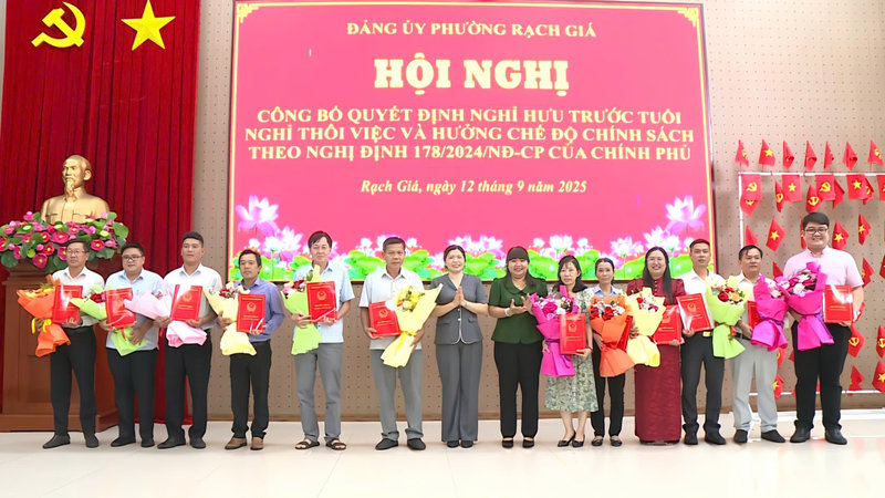 Theo các Quyết định được công bố, đợt này phường Rạch Giá có 31 đồng chí được hưởng chế độ theo Nghị định số 178/2024/NĐ-CP và Nghị định số 67/2025/NĐ-CP của Chính phủ. Cụ thể, khối Đảng, Mặt trận có 10 đồng chí, trong đó có 2 đồng chí nghỉ hưu trước tuổi và 8 đồng chí nghỉ thôi việc. Khối UBND phường có 21 đồng chí được công bố quyết định nghỉ thôi việc.