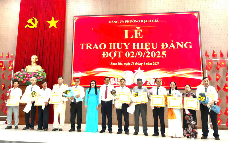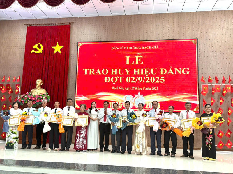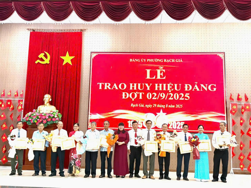Nhân dịp kỷ niệm 80 năm Ngày Cách mạng Tháng Tám thành công (19/8/1945-19/8/2025) và Quốc khánh nước Cộng hòa xã hội chủ nghĩa Việt Nam (2/9/1945-2/9/2025), sáng ngày 29/8, Ban Thường vụ Đảng ủy phường Rạch Giá trang trọng tổ chức Lễ trao tặng huy hiệu Đảng đợt 2/9 cho các đảng viên cao niên tuổi Đảng đang sinh hoạt tại các chi bộ, đảng bộ trực thuộc. Đến dự lễ có đồng chí Nguyễn Thị Hoàn Xuân - Phó Bí thư Thường trực Đảng ủy, Chủ tịch HĐND phường; đồng chí Bùi Trung Thực - Phó Bí thư Đảng ủy, Chủ tịch UBND phường; các đồng chí Ủy viên Ban Thường vụ Đảng ủy; các đồng chí Bí thư chi bộ, đảng bộ trực thuộc Đảng ủy có đảng viên được nhận huy hiệu Đảng.