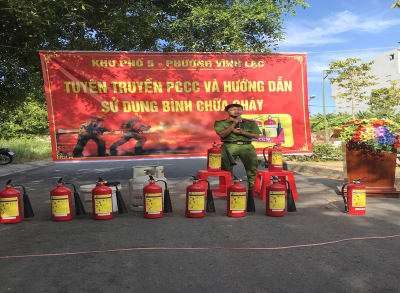 Tại khu phố 5, phường Vĩnh Lạc đã tổ chức tuyên truyền công tác phòng cháy, chữa cháy và hướng dẫn sử dụng bình chữa cháy. Đến tham dự cấp phường có đồng chí Võ Thị Minh Hòa, Phó Bí thư Thường trực Đảng ủy, Chủ tịch HĐND phường, đồng chí Trần Văn Phận, Phó Trưởng Công an phường Vĩnh Lạc và các đ/c HĐND, UBND, UBMTTQ, các đoàn thể phường, công an phường; Cấp khu phố có đ/c Đinh Văn Quang, ĐUV, Bí thư-Trưởng khu phố 5 cùng các đ/c Chi ủy viên, BLĐ khu phố, đoàn thể khu phố và đại diện 40 tổ NDTQ tham dự. Đại diện Công an phường Vĩnh Lạc đã tuyên truyền cho người dân những kiến thức cơ bản về công tác phòng cháy chữa cháy; cách thức bảo quản, hướng dẫn sử dụng các loại bình chữa cháy xách tay.