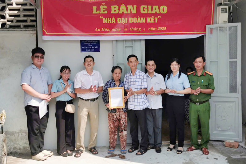 Ảnh: Ban Chỉ đạo “xóa nhà tạm, nhà dột nát” phường An Hòa trao nhà “Đại Đoàn Kết” cho bà Hồ Quấy Khóa, cư ngụ 571 đường Trần Khánh Dư, khu phố 7. Căn nhà có tổng diện tích 35 mét vuông, trị giá 79 triệu đồng, trong đó Quỹ “Vì người nghèo” thành phố Rạch Giá: 60 triệu, số còn lại do Ủy ban mặt trận tổ quốc Việt Nam phường An Hòa vận động mạnh thường quân đóng góp 9 triệu, gia đình đối ứng 10 triệu đồng.