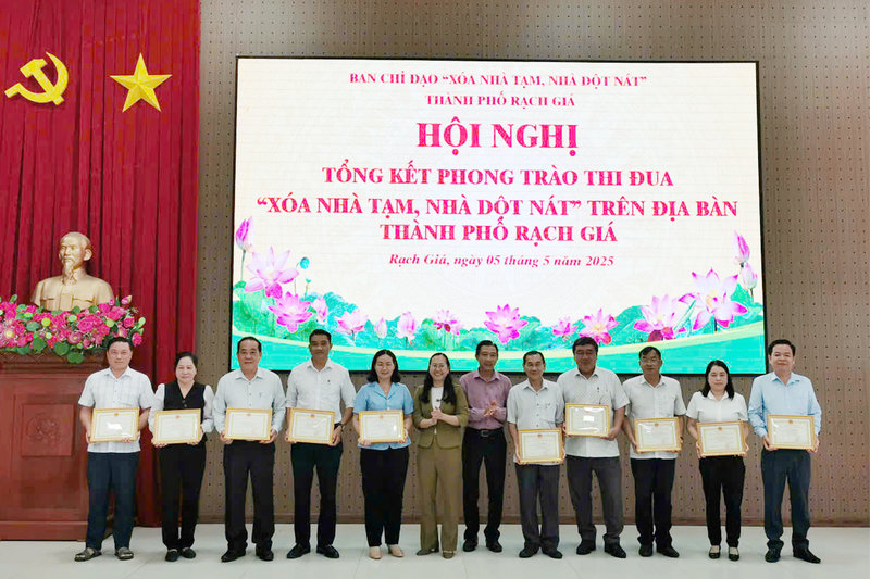 Ảnh: Ủy ban nhân dân thành phố Rạch Giá đã trao tặng giấy khen cho 12 tập thể và 20 cá nhân đã đạt thành tích tốt trong phong trào thi đua “Xóa nhà tạm, nhà dột nát” trên địa bàn thành phố Rạch Giá năm 2025./.
