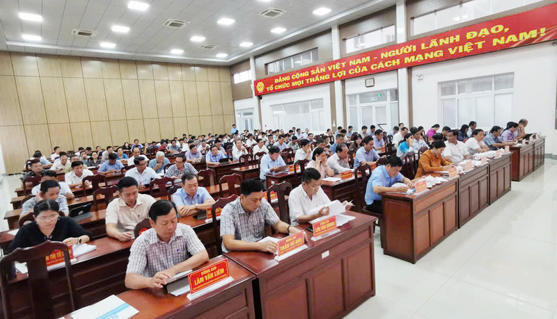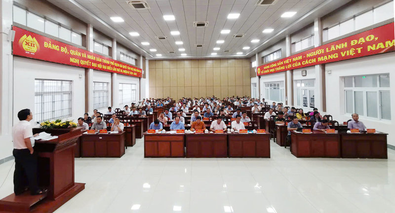 Ảnh: Tập thể Ban Thường vụ Thành ủy, Ủy viên Ban Chấp hành Đảng bộ thành phố, Bí thư chi bộ, Đảng bộ trực thuộc, trưởng các phòng, ban, ngành, Chủ tịch Ủy ban mặt trận tổ quốc, các đoàn thể chính trị, xã hội thành phố; Chủ tịch Ủy ban nhân dân, Bí thư, trưởng khu phố, ấp các phường, xã tại hội nghị tiếp thu nghị quyết.