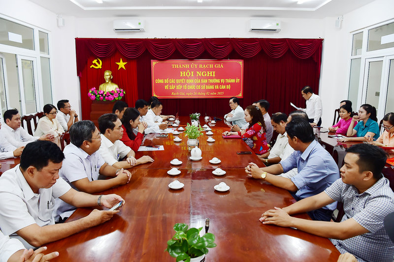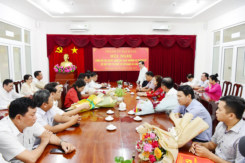 Ảnh: Đồng chí Tô Việt Huỳnh, Ủy viên Ban Thường vụ - Trưởng Ban Tổ chức Thành ủy Rạch Giá công bố các quyết định của Ban Thường vụ Thành ủy Rạch Giá về việc giải thể các Chi bộ không phù hợp về mặt tổ chức; đồng thời thành lập mới, chỉ định Ban Chấp các Chi bộ trực thuộc Thành ủy, nhiệm kỳ 2020 – 2025 gồm: Thành lập mới: Chi bộ phòng Y tế thành phố, Chi bộ Chi nhánh Văn phòng đăng ký đất đai, phòng Kinh tế - Hạ tầng và Đô thị và Chi bộ phòng Nông nghiệp và Môi trường; đổi tên Chi bộ phòng Tài Chính - Kế hoạch thành Chi bộ phòng Tài chính thành phố; đổi tên Chi bộ phòng Văn hóa và Thông tin thành Chi bộ phòng Văn hóa - Khoa học và Thông tin; kiện toàn Chi bộ phòng Nội vụ thành phố.