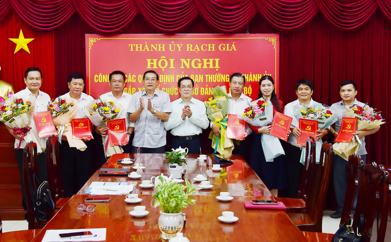 Ảnh: Đồng chí Phạm Hoàng Nam, Ủy viên Ban Thường vụ Tỉnh ủy – Bí thư Thành ủy Rạch Giá (thứ năm phải qua) và đồng chí Nguyễn Văn Nhỏ, Phó Bí thư Thường trực Thành ủy, Chủ tịch Hội đồng nhân dân thành phố (thứ sáu phải qua) trao hoa chúc mừng các đồng chí được chỉ định giữ chức Bí thư Chi bộ mới