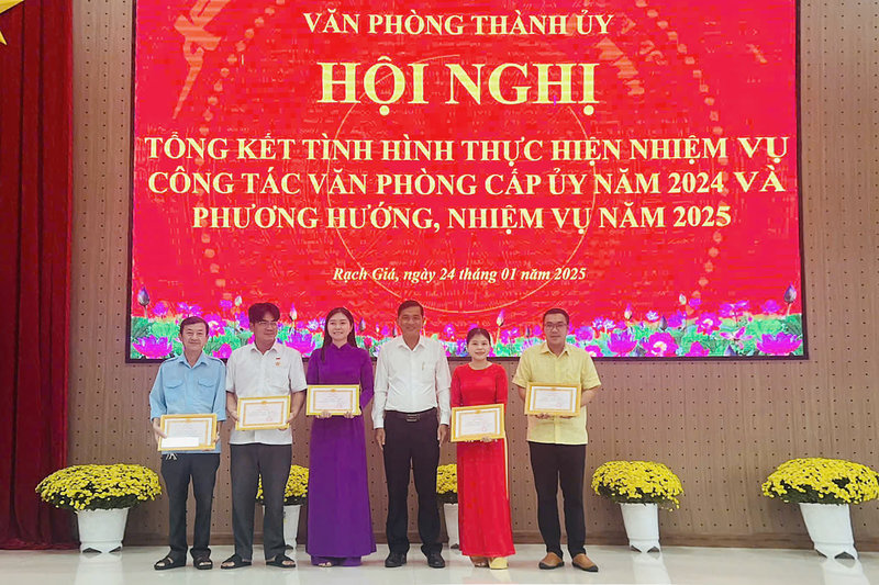 Ảnh: Đồng chí Danh Tài, Thành ủy viên, Chánh Văn phòng Thành ủy (thứ ba phải qua) trao tặng giấy khen cho 5 đồng chí đạt thành tích tốt trong thực hiện nhiệm vụ năm 2024; khen thưởng cho 4 cá nhân đạt thành tích xuất sắc trong thi đua chuyên đề Văn phòng cấp ủy năm 2024