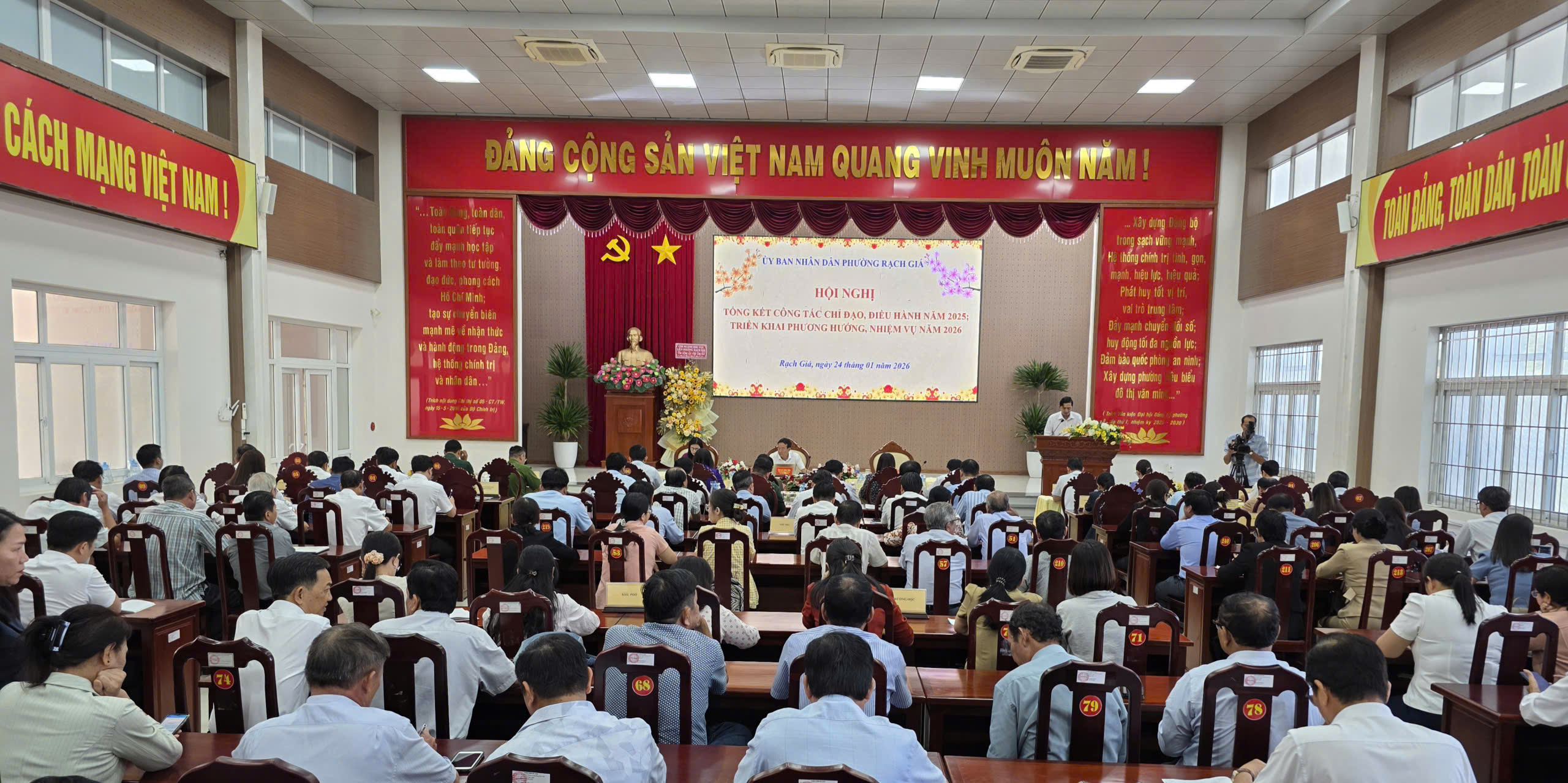Ngày 24/01/2026, UBND phường Rạch Giá tổ chức Hội nghị tổng kết công tác chỉ đạo, điều hành năm 2025 và triển khai phương hướng, nhiệm vụ năm 2026. Đồng chí Bùi Trung Thực – Phó Bí thư Đảng ủy, Chủ tịch UBND phường cùng các Phó Chủ tịch UBND phường đồng chí Nguyễn Thị Hồng Linh và đồng chí Dương Hồng Tuấn chủ trì hội nghị.