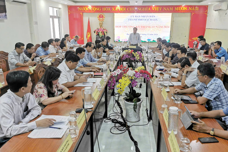 Thường trực Ủy ban nhân dân thành phố Rạch Giá đã ghi nhận ý kiến phản ảnh của lãnh đạo Ủy ban nhân dân các phường, xã, phòng, ban, ngành chức năng thành phố trong việc đề ra các giải pháp tích cự, hiệu quả để hoàn thành đạt các chỉ tiêu, nhiệm vụ phát triển kinh tế, văn hóa-xã hội năm 2024. Trong đó chú trọng đẩy mạnh các hoạt động thương mại, dịch vụ lưu trú, ăn uống, nâng cao giá trị sản xuất ngành nông nghiệp, thủy sản,..; công tác kiểm tra, kiểm soát thị trường, chống hàng giả, gian lận thương mại, bình ổn giá cả thị trường phục vụ Tết Dương lịch và Tết Nguyên Đán Ất Tỵ năm 2025; tập trung chỉ đạo và triển khai thực hiện các giải pháp chống khai thác hải sản bất hợp pháp, không báo cáo và không theo quy định; công tác quản lý đô thị có chuyển biến tích cực, nhất là trên lĩnh vực trật tự xây dựng, trật tự đô thị, vệ sinh môi trường; từng bước giải quyết triệt để việc mua bán lấn chiếm lòng đường, lề đường, vỉa hè; lập lại hành lang an toàn đường bộ; từng bước nâng cao chất lượng, hiệu quả giải quyết thủ tục hành chính, nhất là trên lĩnh vực xây dựng, đất đai; đảm bảo thực hiện tốt các bước tuyển chọn và gọi công dân nhập ngũ năm 2025.
